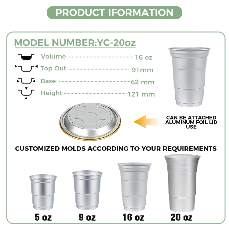 Yunchu သည် တရုတ်နိုင်ငံတွင် 16oz တစ်ခါသုံး စိတ်ကြိုက်လူမီနီယမ်သတ္တုပြားဖျော်ရည်ခွက်ကို ထုတ်လုပ်သည့် ထိပ်တန်းကုမ္ပဏီတစ်ခုဖြစ်သည်။ ဤ 16oz တခါသုံး စိတ်ကြိုက် အလူမီနီယမ် ဖောင်သောက်ခွက်သည် ကော်ဖီနှင့် ဘီယာကဲ့သို့ ပုံမှန်အဖျော်ယမကာများအတွက် သင့်လျော်သော 460-မီလီလီတာ အလူမီနီယမ်သတ္တုပြားခွက်ဖြစ်သည်။ ၎င်းသည် စံချိန်စံညွှန်းမီသော ဒီဇိုင်းကို ပါ၀င်ပြီး မကြာခဏ စိတ်ကြိုက်ပြင်ဆင်မှု လိုအပ်ချက်များရှိသည့် ကော်ဖီဆိုင်များနှင့် လက်မှုပညာဘားများကဲ့သို့သော စီးပွားဖြစ်အသုံးပြုသူများကို အဓိက ပစ်မှတ်ထားသည်။ ထိရောက်သော အပူအကူးအပြောင်းနှင့် အခြေခံ တံဆိပ်ခတ်ခြင်း စွမ်းဆောင်ရည်ကို ပံ့ပိုးပေးနေစဉ်၊ ဤ 16oz တခါသုံး စိတ်ကြိုက်ပြန်လည်အသုံးပြုနိုင်သော အလူမီနီယံ ဖောင်အချိုရည်ခွက်သည် မြန်ဆန်ပြီး လိုက်လျောညီထွေရှိသော အမှတ်တံဆိပ်အမြင်အာရုံ စိတ်ကြိုက်ပြုပြင်ခြင်းဝန်ဆောင်မှုများကို ပိုမိုအလေးပေးပါသည်။