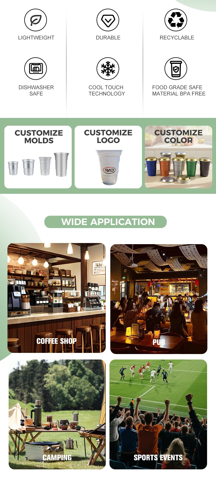 ကူးသန်းရောင်းဝယ်ရေး လှုပ်ရှားမှု အခြေအနေများ- ပြပွဲများ၊ သတင်းစာ ရှင်းလင်းပွဲများ၊ စီးပွားရေး လက်ဖက်ရည်ဆိုင် အနားယူချိန်များနှင့် အခြားအချိန်အခါများ။ ဤအလူမီနီယမ်ခွက်ကို ဓာတ်သတ္တုရေနှင့် တောက်ပြောင်သောရေကဲ့သို့သော အဖျော်ယမကာများကို ကိုင်ဆောင်ထားနိုင်သည်။ ၎င်းသည် ပေါ့ပါးပြီး ယူရလွယ်ကူပြီး ၎င်း၏ ပြန်လည်အသုံးပြုနိုင်သည့် ရည်ညွှန်းချက်မှာ ကုမ္ပဏီ၏ အစိမ်းရောင်ရုံးခန်းပုံနှင့် ကိုက်ညီပါသည်။ မီနီကော့တေးများ ပြင်ဆင်ခြင်း၊ ဝီစကီကိုင်ဆောင်ခြင်း စသည်တို့ကို ဘားများနှင့် ရှင်းလင်းသောဘားများတွင် အသုံးပြုနိုင်သည်။ သတ္တုခွက်ကိုယ်ထည်သည် အေးမြမှုကို လျင်မြန်စွာ ထုတ်လွှတ်နိုင်ပြီး ရေခဲ-အအေး၏ အရသာကို မြှင့်တင်ပေးကာ တစ်ချိန်တည်းတွင် နိုက်ကလပ်၏ စတိုင်လ်ကို ဖက်ရှင်ကျကျ ဖန်တီးနိုင်သည်။