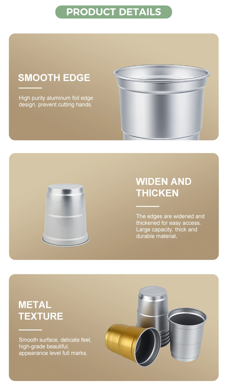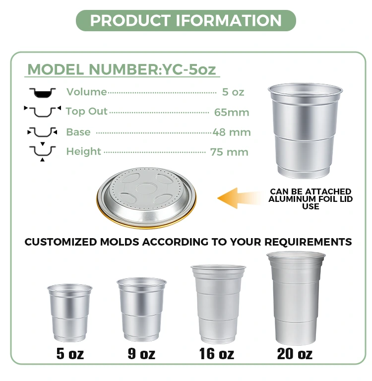 Yunchu အလူမီနီယမ်သတ္တုပြား ပေးသွင်းသူ၏ 5oz တစ်ခါသုံး ပြန်လည်အသုံးပြုနိုင်သော အအေးခန်း အလူမီနီယမ် အဖျော်ယမကာခွက်သည် ရိုးရှင်းပြီး အံဝင်ခွင်ကျရှိသော အလူမီနီယမ်သတ္တုဖြင့် ပြုလုပ်ထားသော ဤဖျော်ရည်ခွက်သည် ကျယ်ပြန့်သော အခြေအနေများအတွက် သင့်လျော်ပြီး စီးပွားဖြစ်လည်ပတ်မှု၊ အပန်းဖြေစုဝေးပွဲများ၊ အကြီးစားပွဲများ စသည်တို့ကို လွှမ်းခြုံကာ နယ်ပယ်ပေါင်းစုံကို လွှမ်းခြုံကာ ဇာတ်လမ်းပုံစံ-အခြေခံထုပ်ပိုးမှုများအတွက် ဦးစားပေးဖြေရှင်းချက်ဖြစ်လာသည်-