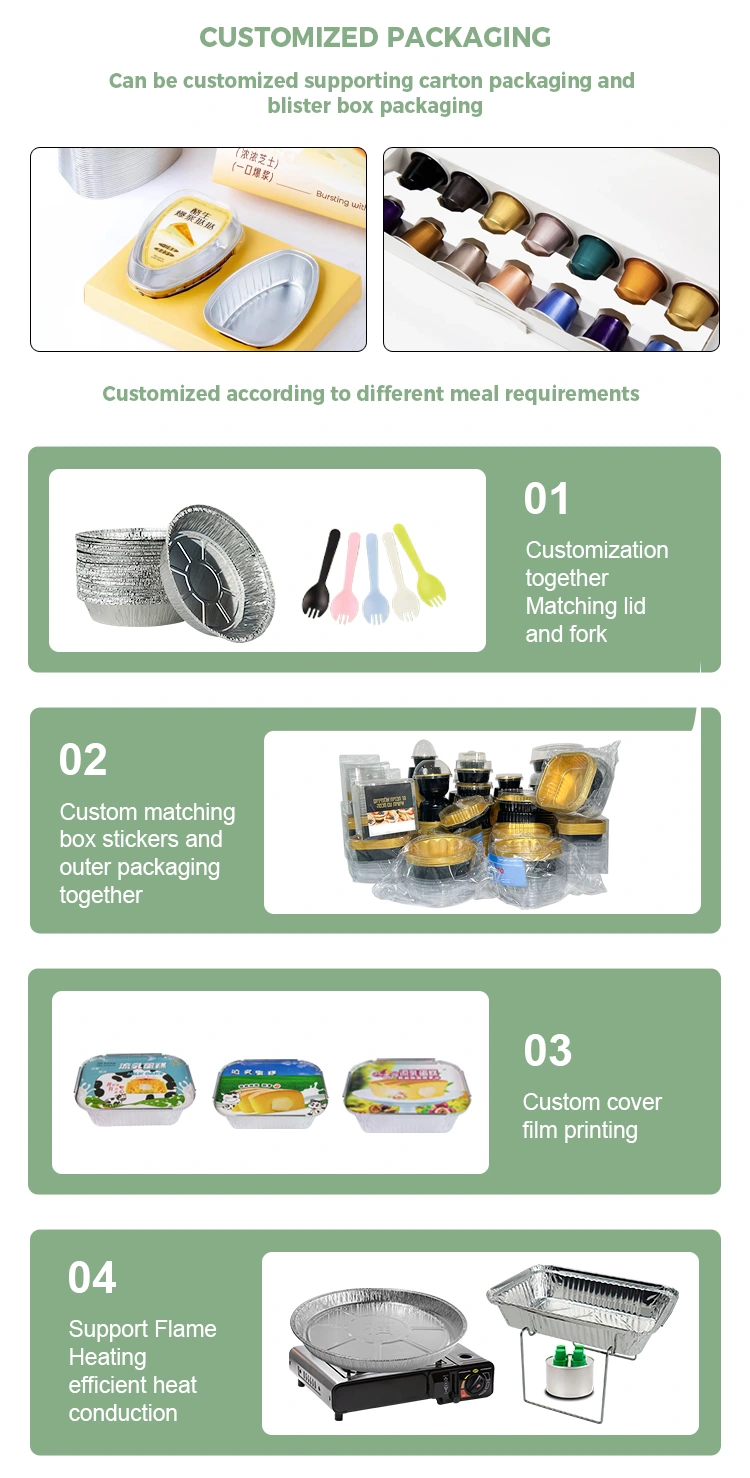 အစားအသောက်နှင့် လက်လီရောင်းချသည့် အခြေအနေများ- ကော်ဖီဆိုင်များ၊ နို့လက်ဖက်ရည်ဆိုင်များနှင့် ဖျော်ရည်ဆိုင်များကို အချိုရည်နှင့် နမူနာပုံစံငယ်များကိုင်ဆောင်ရန် အသုံးပြုနိုင်သည်။ လက်ရာမြောက်သော စွမ်းရည်နှင့် သတ္တုတောက်ပမှုတို့သည် အမှတ်တံဆိပ်၏ အသွင်အပြင်ကို မြှင့်တင်ပေးသည်။ ရေခဲမုန့်ဆိုင်များနှင့် အချိုပွဲဆိုင်များတွင် ရေခဲမုန့်လုံးများ၊ သေးငယ်သော အစိတ်အပိုင်းများ သယ်ဆောင်ရန် အချိုပွဲခွက်များအဖြစ် အသုံးပြုနိုင်ပါသည်။ အလူမီနီယမ်ပစ္စည်းသည် အပူချိန်နိမ့်ကျမှုကို ပိုမိုကောင်းမွန်စွာ ထိန်းသိမ်းနိုင်ပြီး အရသာ၏ သက်တမ်းကို သက်တမ်းတိုးစေသည်။ Yunchu Aluminum Foil ၏ ပရော်ဖက်ရှင်နယ် ထုတ်လုပ်မှုစွမ်းရည်များသည် ခွက်ကိုယ်ထည်ပေါ်ရှိ အမှတ်တံဆိပ်လိုဂိုများကို စိတ်ကြိုက်ပြင်ဆင်ခြင်းကို ပံ့ပိုးပေးနိုင်ပြီး ကုန်သည်များ၏ အမှတ်တံဆိပ်အသိအမှတ်ပြုမှုကို အားကောင်းစေပါသည်။