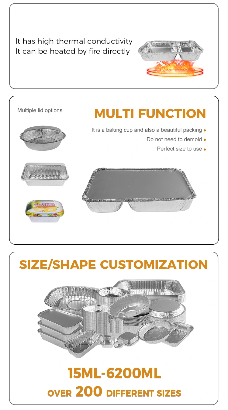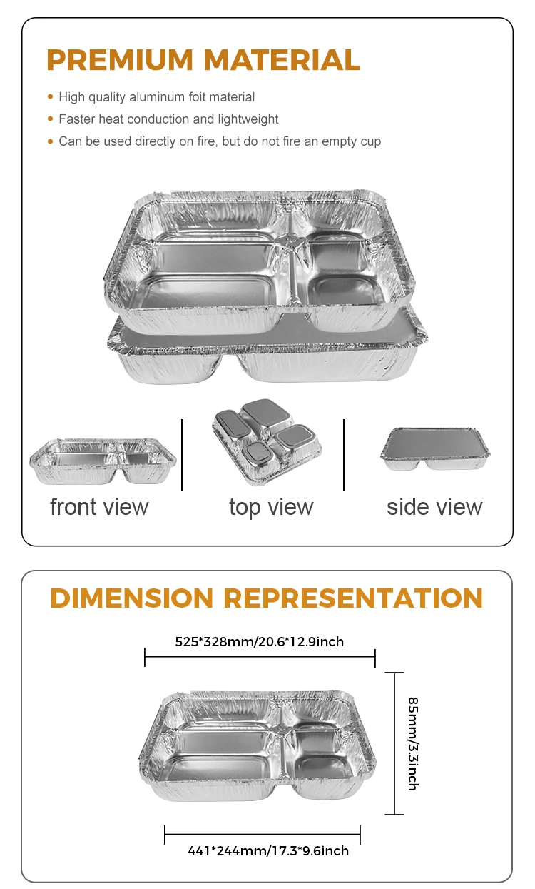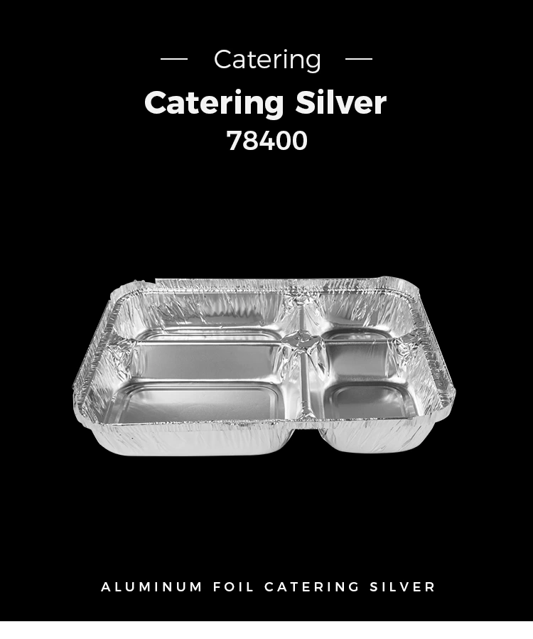 Yunchu Aluminum Foil Supply Factory launched a new Disposable multi-compartment fast food Silver Aluminum Foil Containers, model number 78400. The container is cleverly designed, with an upper diameter of 244 mm (9.6 in) and 195 mm (7.6 in) and a lower diameter of 217 mm (8.5 in) and 168 mm (6.6 in), with an overall height of only 41 mm (1.6 အတွက်) ။ ခန့်မှန်းခြေအားဖြင့် 1020 ML (36.0 အောင်ဇဇ) စွမ်းရည်နှင့်အတူအခန်းလေးအခန်းများတွင်အစားအစာအမျိုးမျိုးကိုကိုင်ထားခြင်းအတွက်အဆင်ပြေပြီးလက်တွေ့ကျသည်။
