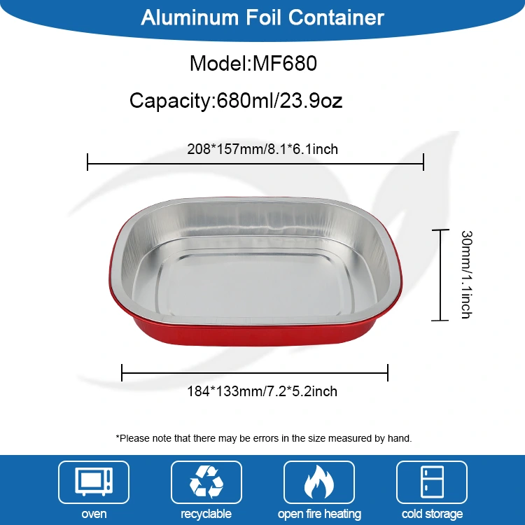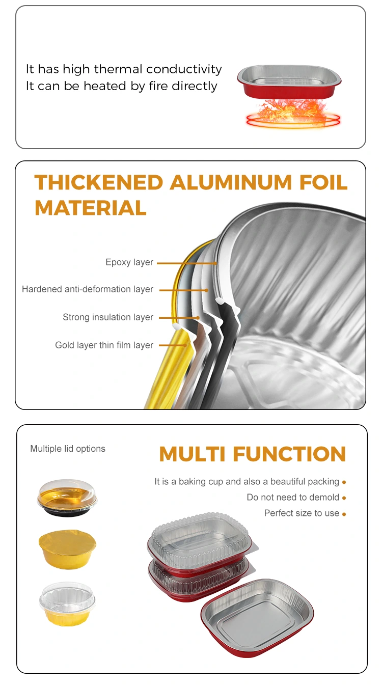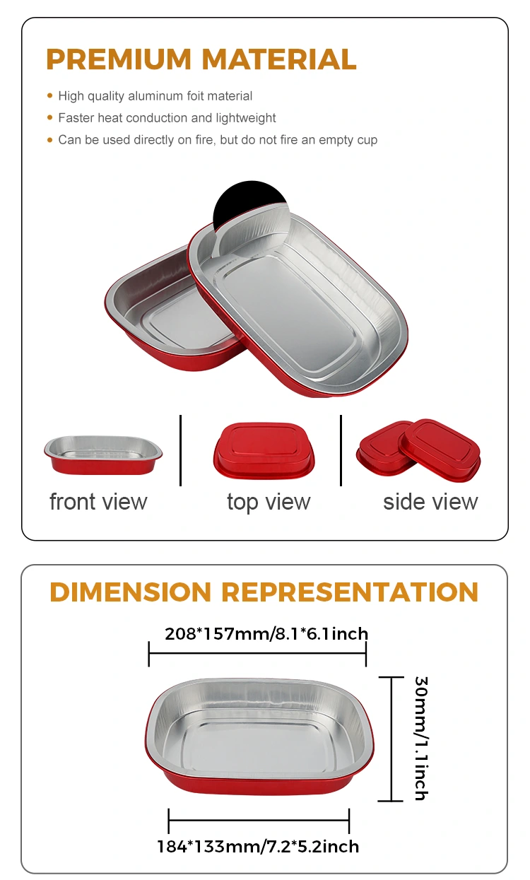 Yunchu သည် တရုတ်နိုင်ငံရှိ Aluminum Foil Containers များကို ပရော်ဖက်ရှင်နယ် ထုတ်လုပ်သူနှင့် ပေးသွင်းသူဖြစ်သည်။ သင့်အတွက် အချင်း 208 * 157 မီလီမီတာ (8.1 * 6.1 လက်မ) ရှိသော တခါသုံး အနီရောင် ထမင်းဘူးစတုရန်း အလူမီနီယမ်သတ္တုပြား ကွန်တိန်နာများ။ အောက်ပိုင်းအချင်း 184*133 (7.2*5.2 လက်မ)၊ အမြင့် 30 (1.1 လက်မ) နှင့် ပမာဏ 680 မီလီလီတာ (23.9OZ) ခန့်ရှိသည်။ ၎င်းသည် အစားအစာအဆင့် 8011 အစားအစာအဆင့် အလူမီနီယမ်သတ္တုပြား ထူထပ်သော အခြေခံပစ္စည်းကို လက်ခံထားပြီး၊ ခိုင်ခံမှုနှင့် ဝန်ထမ်းနိုင်မှုစွမ်းရည်တို့ကို ထည့်သွင်းစဉ်းစားကာ ပုံပျက်ရန် သို့မဟုတ် ယိုစိမ့်ရန် မလွယ်ကူသည့်အပြင် အစားအစာကို တိုက်ရိုက်ထောက်ပံ့ပေးနိုင်သည်။ ၎င်းသည် အလွန်ကျယ်ပြန့်သော အပူချိန် အကွာအဝေး -20 ℃ မှ 220 ℃ နှင့် တွဲဖက်အသုံးပြုနိုင်ပါသည်။ ပုံသွင်းရန်မလိုအပ်ပါ။ အသုံးပြုရန်အတွက် မီးဖို၊ လေကြော် သို့မဟုတ် ရေနွေးငွေ့ထဲသို့ တိုက်ရိုက်ထည့်နိုင်ပြီး ထိန်းသိမ်းထားရန်အတွက်လည်း ရေခဲသေတ္တာတွင် ထည့်ထားနိုင်သည်။ ၎င်းသည် "ဖုတ် - သိုလှောင်မှု - စားသုံးမှု - စွန့်ပစ်ခြင်း" ၏တစ်နေရာတည်းတွင်အဆင်ပြေသောအတွေ့အကြုံကိုပေးသည်။ အလူမီနီယံသတ္တုပြား၏အဓိကအားသာချက်မှာ၎င်း၏မြင့်မားသောအပူစီးကူးမှုဖြစ်သည်။ ရွှေရောင်အလွှာသည် အပူကိုစုစည်းစေပြီး အစားအစာများကို အညီအမျှနှင့် လျင်မြန်စွာအပူပေးကြောင်း သေချာစေပါသည်။