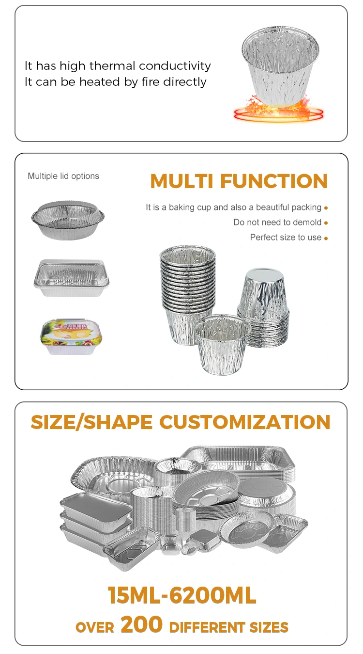 Yunchu အလူမီနီယမ်သတ္တုပြား ပေးသွင်းသူ၏ တစ်ခါသုံး မုန့်ဖုတ်သည့် ကိတ်မုန့် ငွေရောင် အလူမီနီယံသတ္တုပြား ကွန်တိန်နာကို အခြေအနေများစွာတွင် အသုံးပြုနိုင်ပါသည်။