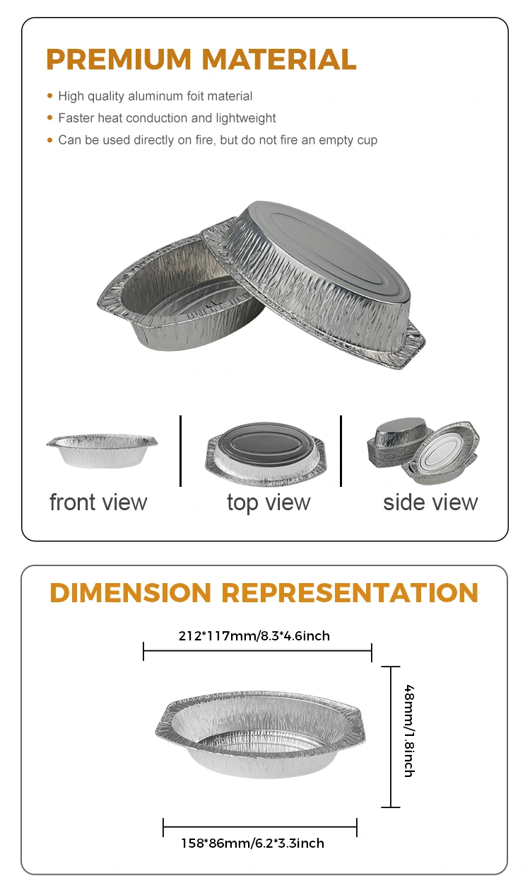 Yunchu အလူမီနီယမ်သတ္တုပါးဘဲဥပုံမုန့်ဖုတ်ပေါင်မုန့်ငွေအလူမီနီယမ်သတ္တုပါးကွန်တိန်နာများကိုမီးဖိုသို့မဟုတ်ကင်တွင်တိုက်ရိုက်အသုံးပြုနိုင်သည်။ အလေးချိန် 5.9 ဂရမ်သာအလေးချိန်ရှိပြီးသပ်သပ်ရပ်ရပ်သိုလှောင်ခြင်း, ထုတ်ကုန်၏အလင်းနံရံဖြစ်စဉ်သည်မျက်နှာပြင်တောက်ပမှုကိုချောမွေ့စေပြီးငွေရောင်တောက်ပမှုသည်လှပပြီးကြော့ရှင်းရုံသာမကစူပါမားကက်များသည်တံဆိပ်နှင့်ကုဒ်များကို 0 င်ရောက်နိုင်သည်။