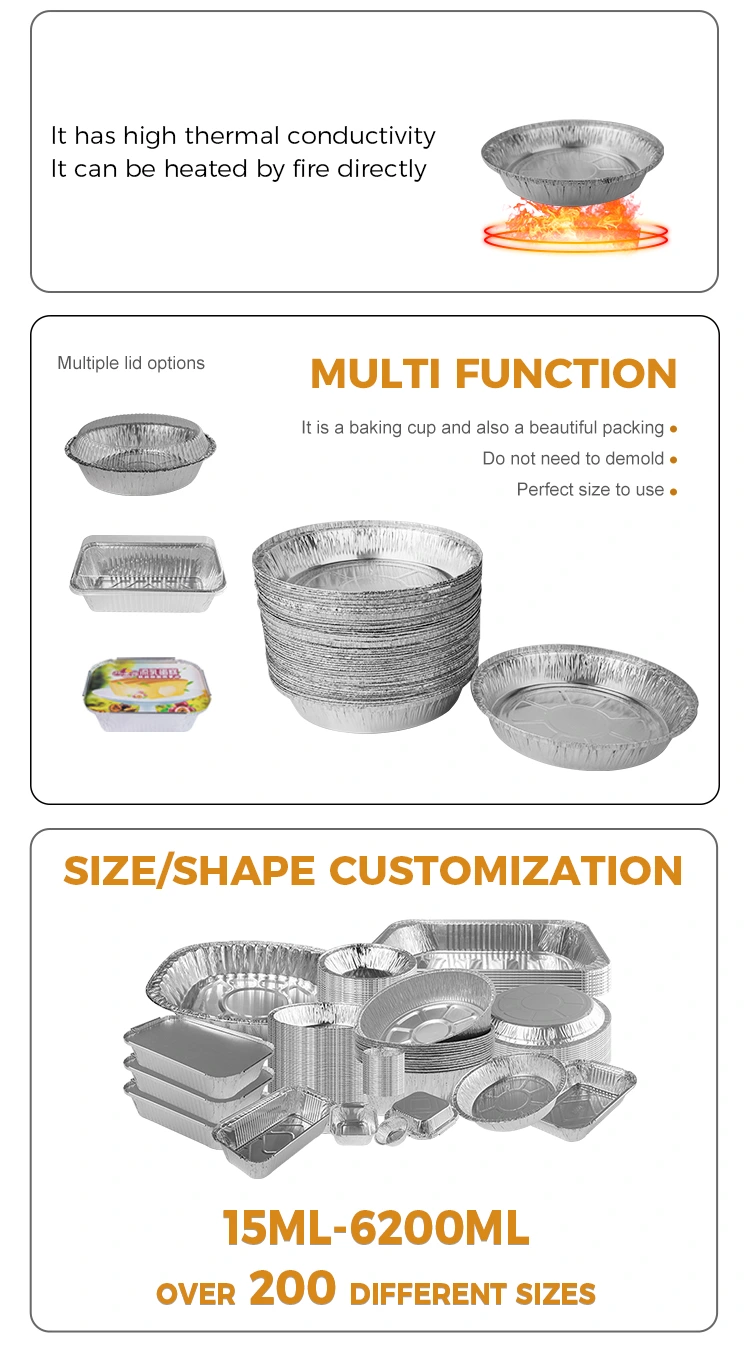 Yunchu Aluminum Foul Foil Foil Foil Fryer Froy Foil Foil Foil Contents, ငွေကိုအလူမီနီယမ်သတ္တုပါးလွှာပစ္စည်းအသိအမှတ်ပြုမှုကိုထုတ်လုပ်သည်။ နှင့်အပူချိန်နိမ့်သော -20 ° C ~ 250 ~ ° C ကို ဖြတ်. မဖြည့်နိုင်ပါ။ အရည်အသွေးမြင့်မားသောပစ္စည်းများ, Round Air Freyer Fryer Froms Silver Foil Hoil Contains သည်စားသောက်ဆိုင်များ, Canteen Catering, ကွင်းဆက်ဆိုင်များ, ရေခဲသေတ္တာအစားအစာများ, မုန့်ဖုတ်ဗန်းသည် 0 န်ဆောင်မှုခံယူနိုင်သောစွမ်းရည်နှင့်ကြာရှည်ခံမှုရှိသည်။ အသုံးပြုသူအတွေ့အကြုံကိုထပ်မံမြှင့်တင်ရန်အသုံးပြုသူများသည်အလူမီနီယမ်သတ္တုပါး lids နှင့်ပွင့်လင်းမြင်သာသောအိမ်မွေးတိရိစ္ဆာန်များနှင့်အတူအသုံးပြုရန်ရွေးချယ်နိုင်သည်။